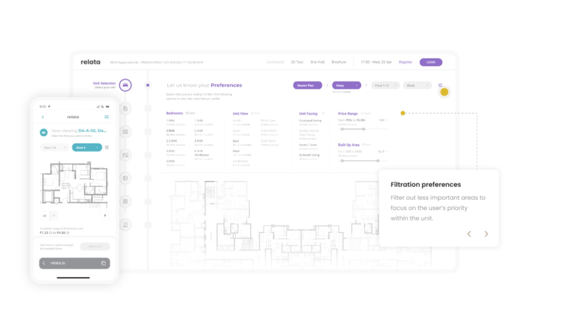 Relata’s inventory and payment management suite helps real estate developers customize and decide how many units are open for booking and track booked and available inventory with real-time updates. Not only that, but this can help you tailor the search experience with custom filters, delve into interactive master plans and detailed floor plans, and manage inventory lifecycles from visibility to registration with ease.