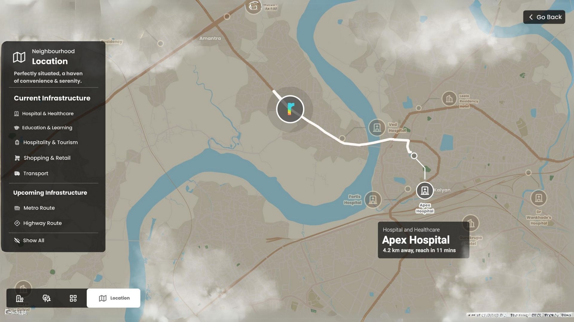 With our interactive routes and information-rich features, users can explore property locations, understand the surrounding landscape, and gain a clear sense of the geographical distance to key landmarks and transportation hubs.